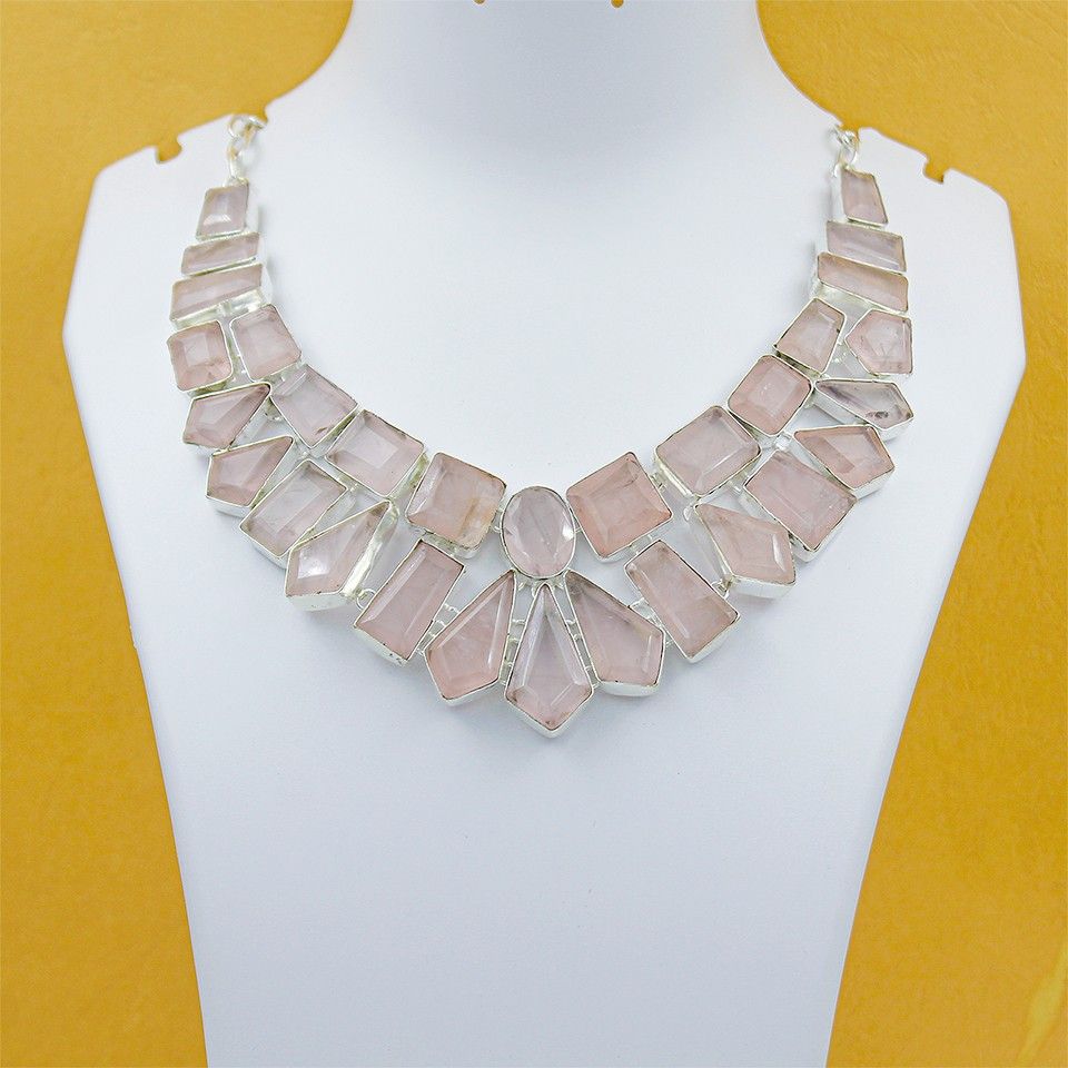 Handcrafted Rose Quartz Necklace for Women Silver Plated Brass Statement...