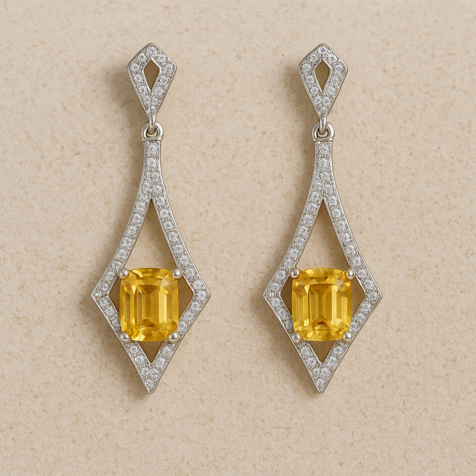 Diamond-Shaped Dangle Earrings for Women 925 Sterling Silver Citrine Gemstone with Cubic Zirconia Designer Fashion Statement Jewellery