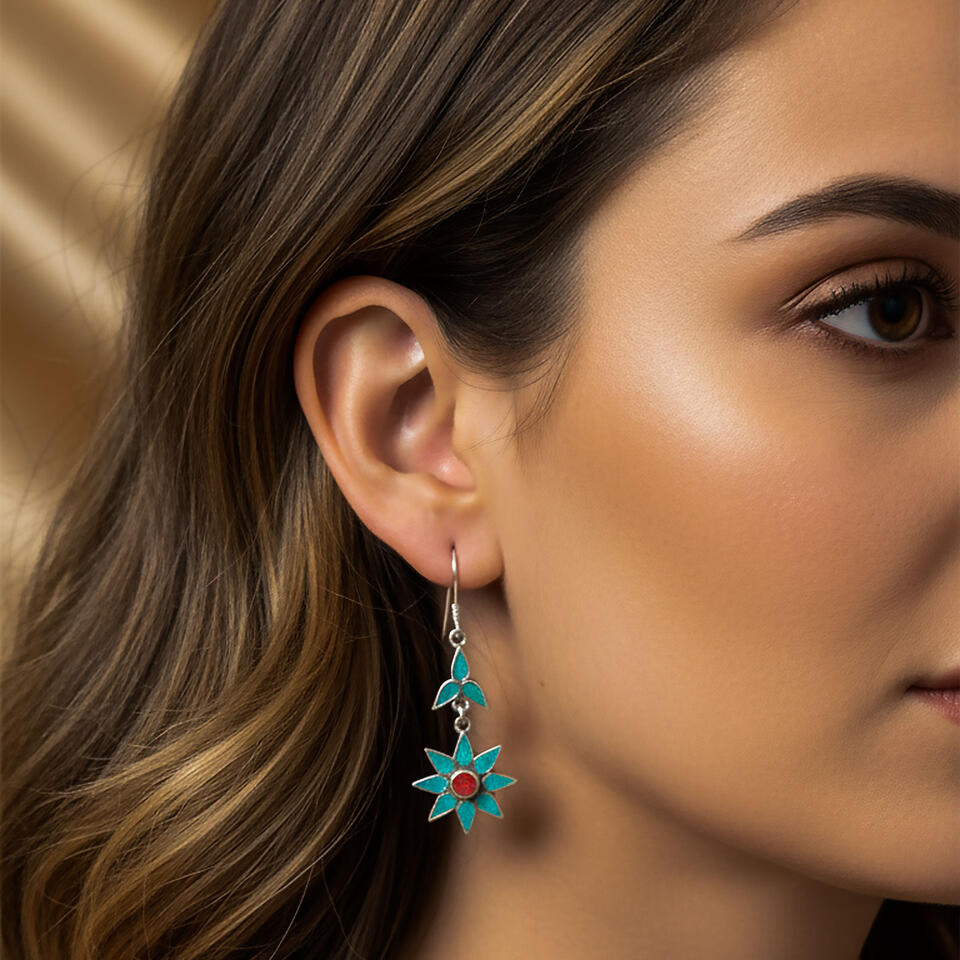 Boho Tibetan Dangle Earrings 925 Sterling Silver Plated Compressed Turquoise & Coral Inlay Ethnic Drop Earrings