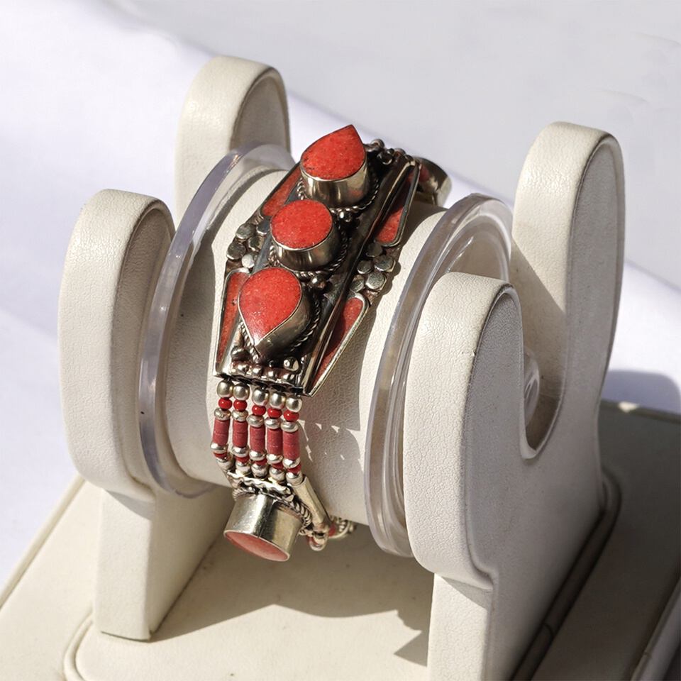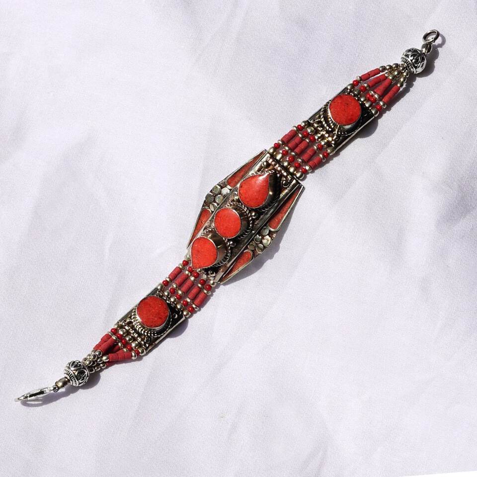 - This handmade Tibetan jewelry bracelet showcases a striking red Coral gemstone, symbolizing vitality and energy. As the birthstone for October, it is especially meaningful for those born in this month. Designed to fit wrist sizes from 6″ to 7″, this bracelet is perfect for most women. Weighing 48 grams, it is an ideal choice for those who appreciate fashionable, designer jewelry. The vibrant red Coral gemstone, with its energetic symbolism, makes this bracelet a must-have accessory for October-born individuals.