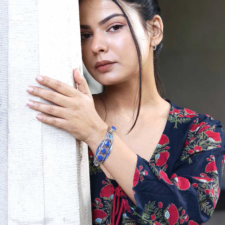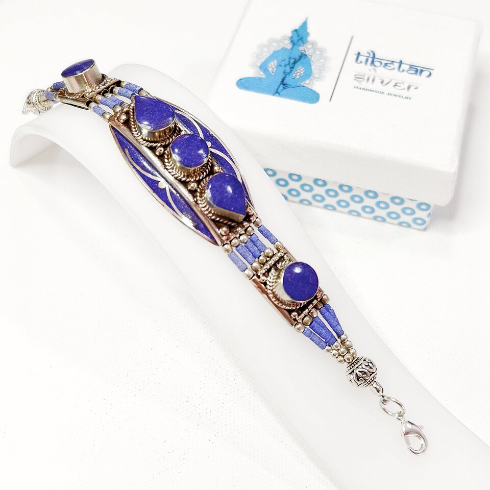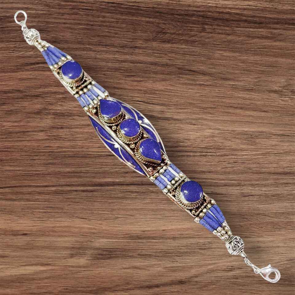 - Embrace bohemian elegance with this handcrafted Tibetan jewelry Lapis Lazuli bracelet, designed to make a striking addition to your collection. The deep blue tones of Lapis Lazuli, the birthstone for September, symbolize wisdom, truth, and royalty. This fashion-forward piece is tailored for wrist sizes 6″ to 7″, offering a perfect fit for a refined and sophisticated look. Weighing 44 grams, it is the ideal choice for women who appreciate unique bohemian style with a touch of elegance.