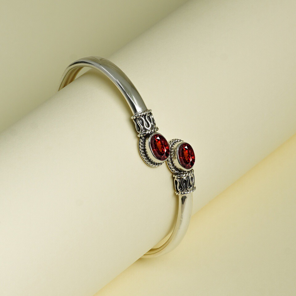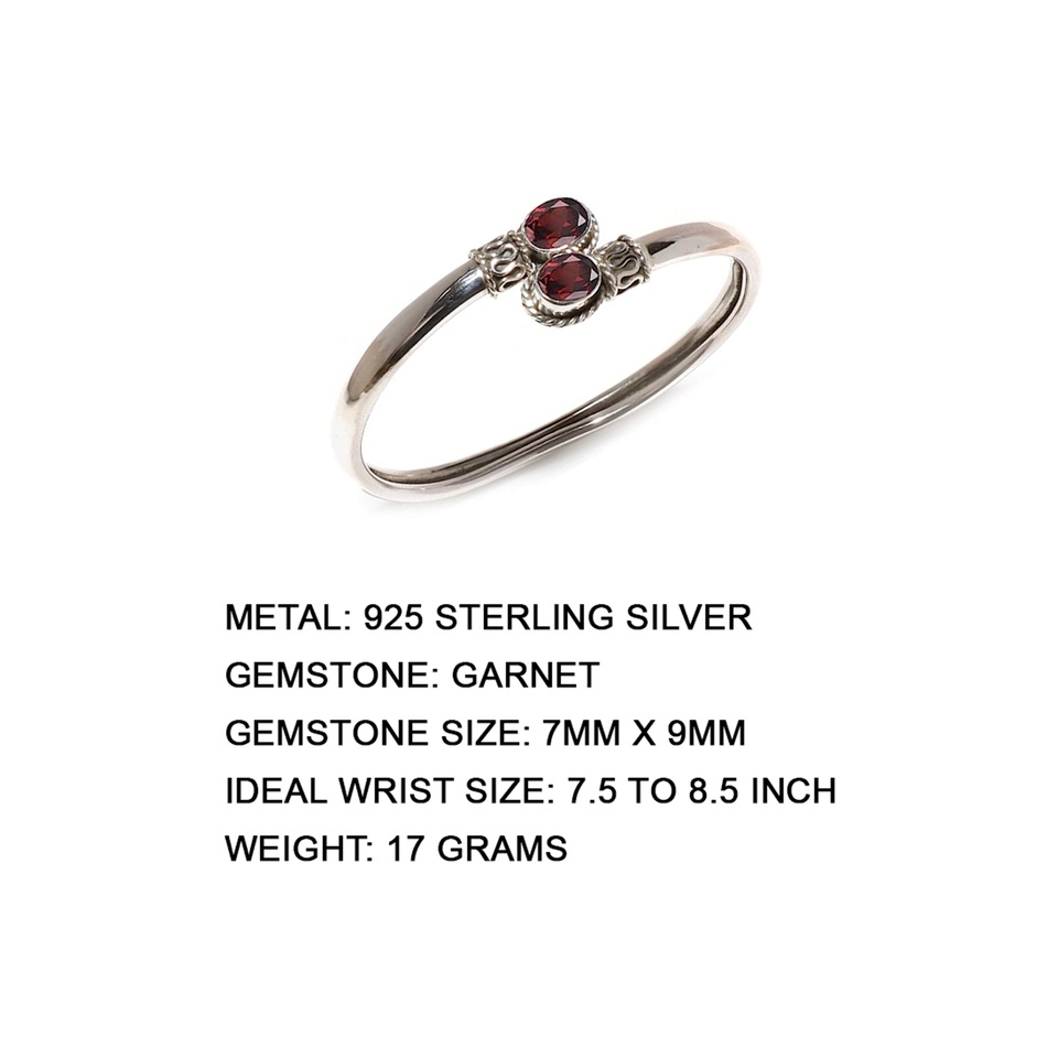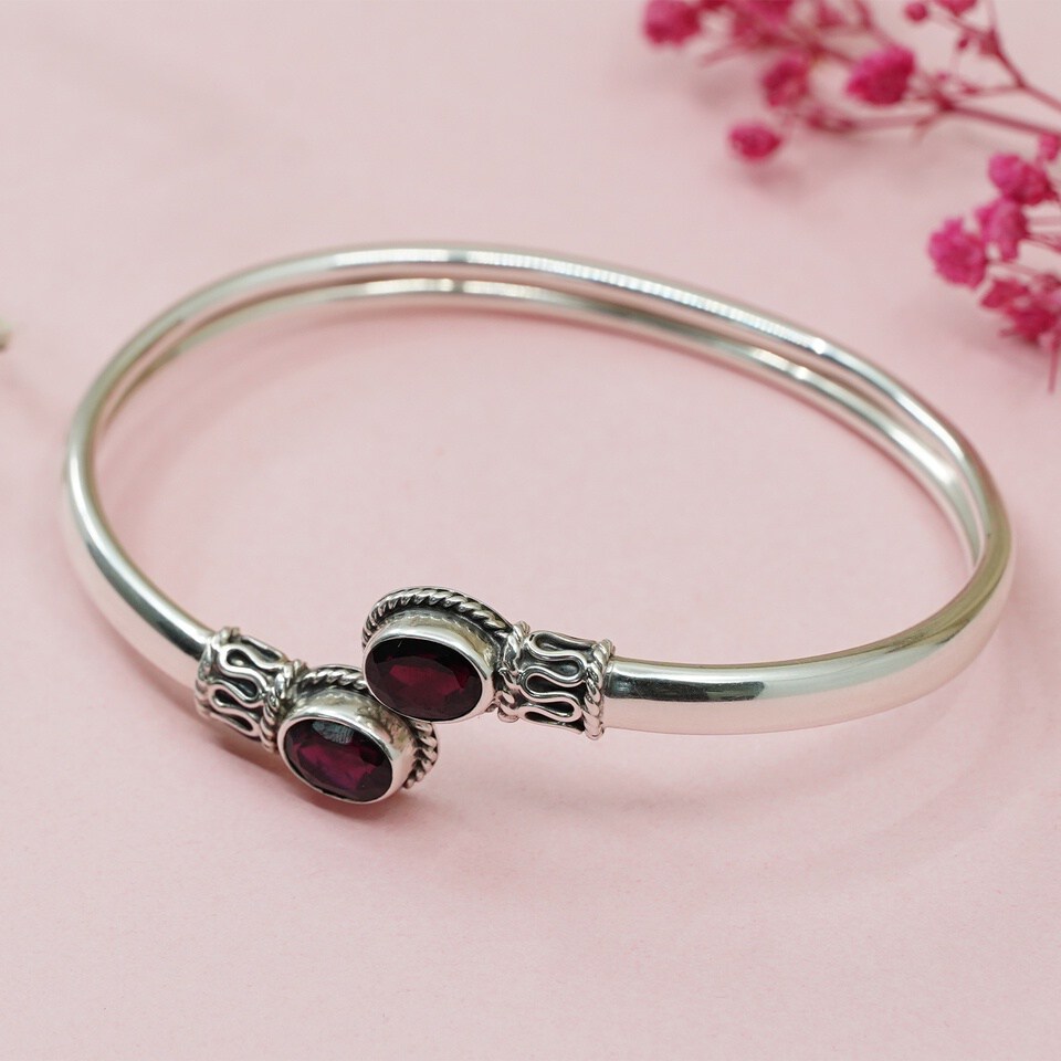 - This exquisite handcrafted cuff bracelet is made from premium 925 sterling silver and features a stunning natural Garnet gemstone, symbolizing strength, protection, and passion. The modern, minimalist design makes it perfect for everyday wear or special occasions. With an inner circumference of 7.75″ and a slightly adjustable fit, this bracelet is ideal for wrist sizes 7″ to 8.25″. The luxurious oval-cut Garnet stone, in a rich red hue, represents the January birthstone, making it a meaningful gift for those born in this month. The bracelet?s sleek design and dainty style combine to make a unique fashion statement, adding elegance and sophistication to any look.
