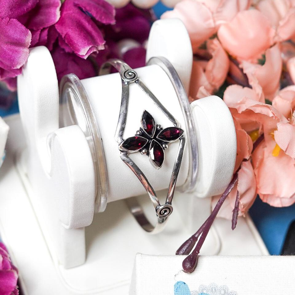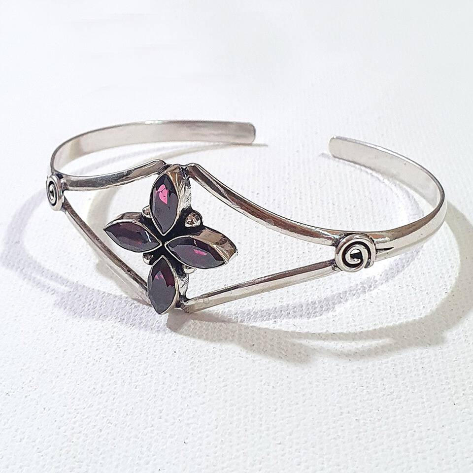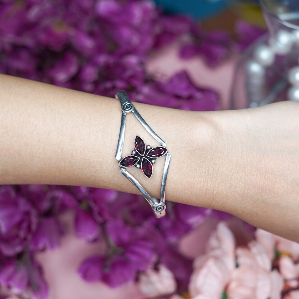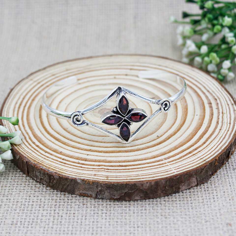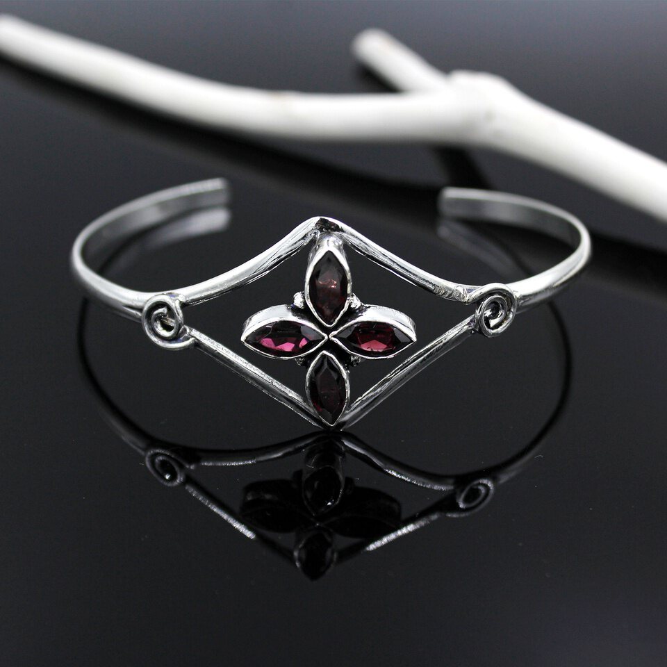 - This handmade, elegant cuff bracelet for women features a luxurious modern design with a red garnet gemstone. The cuff is crafted from silver-plated 925 sterling silver, offering a dainty yet bold statement piece for everyday wear. The gemstone, garnet, is known as the birthstone for January, symbolizing passion and energy. With an adjustable fit, the bracelet suits wrist sizes from 7″ to 8.5″. The marquise-cut gemstone, set in a pav? style, adds a unique touch to this modern contemporary boho design. Ideal for both casual and formal occasions, this bracelet blends fashion and luxury in a statement piece.