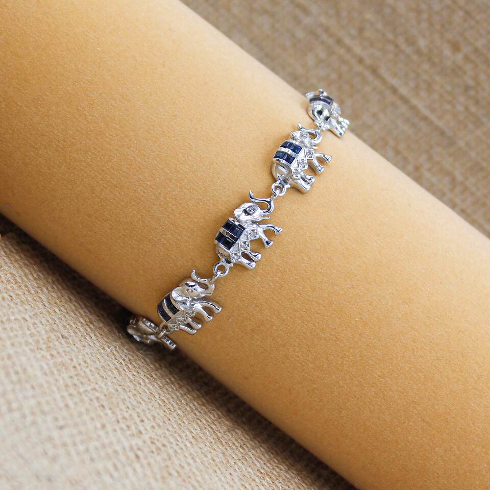 - This elegant 925 sterling silver link bracelet features a stunning blue sapphire gemstone and a detailed elephant charm, symbolizing strength and good fortune. Weighing 18 grams, it fits wrists from 6.5″ to 7.5″ and is secured with a lobster clasp. A unique, fashionable statement piece perfect for any jewelry collection.