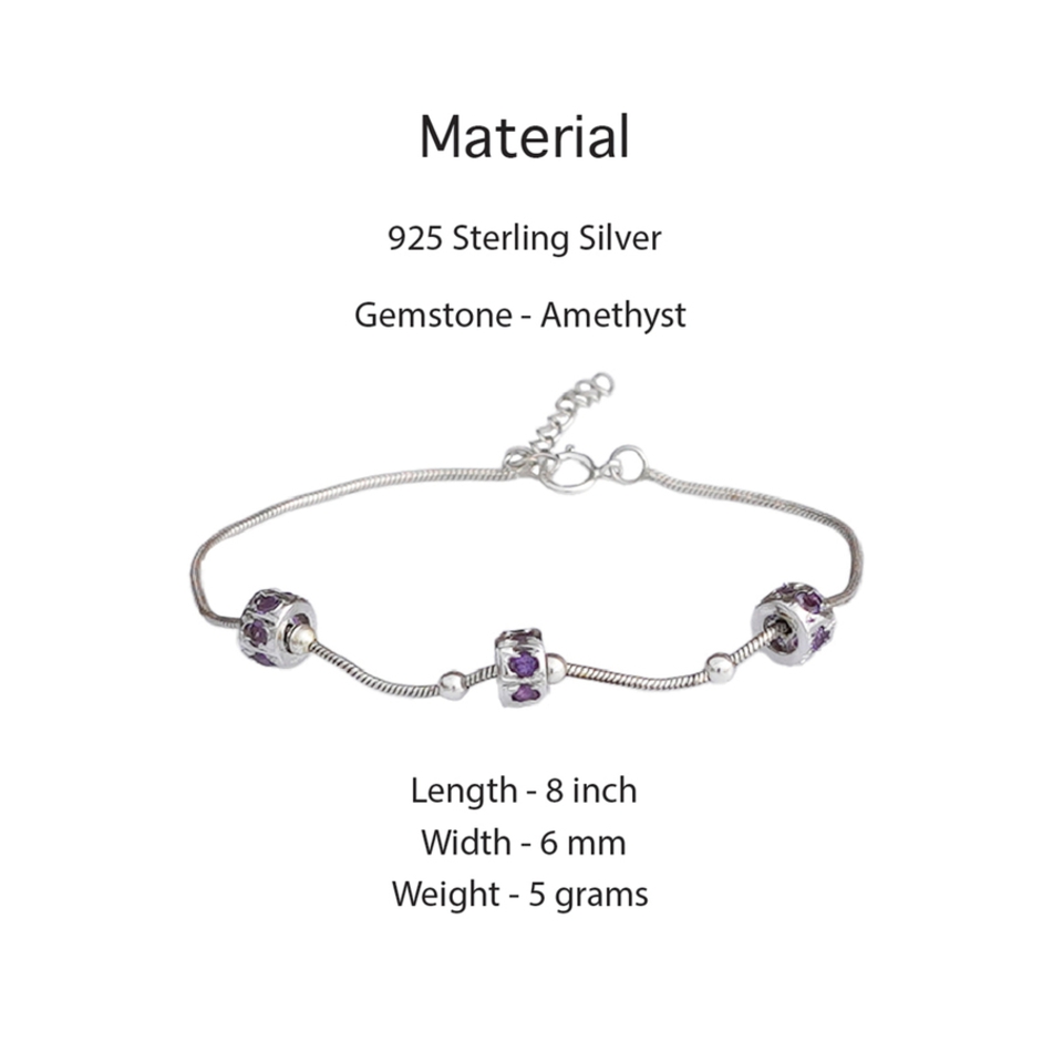 - This elegant 925 sterling silver bracelet features a minimalist snake chain design with purple amethyst accents, adding subtle sophistication. It fits wrist sizes from 6.5″ to 8.5″ with slight adjustability and is ideal for women who appreciate fashion-forward yet simple jewelry. Lightweight at just 5 grams, it’s perfect for daily wear or special occasions, with handmade craftsmanship ensuring a unique, elegant piece.
