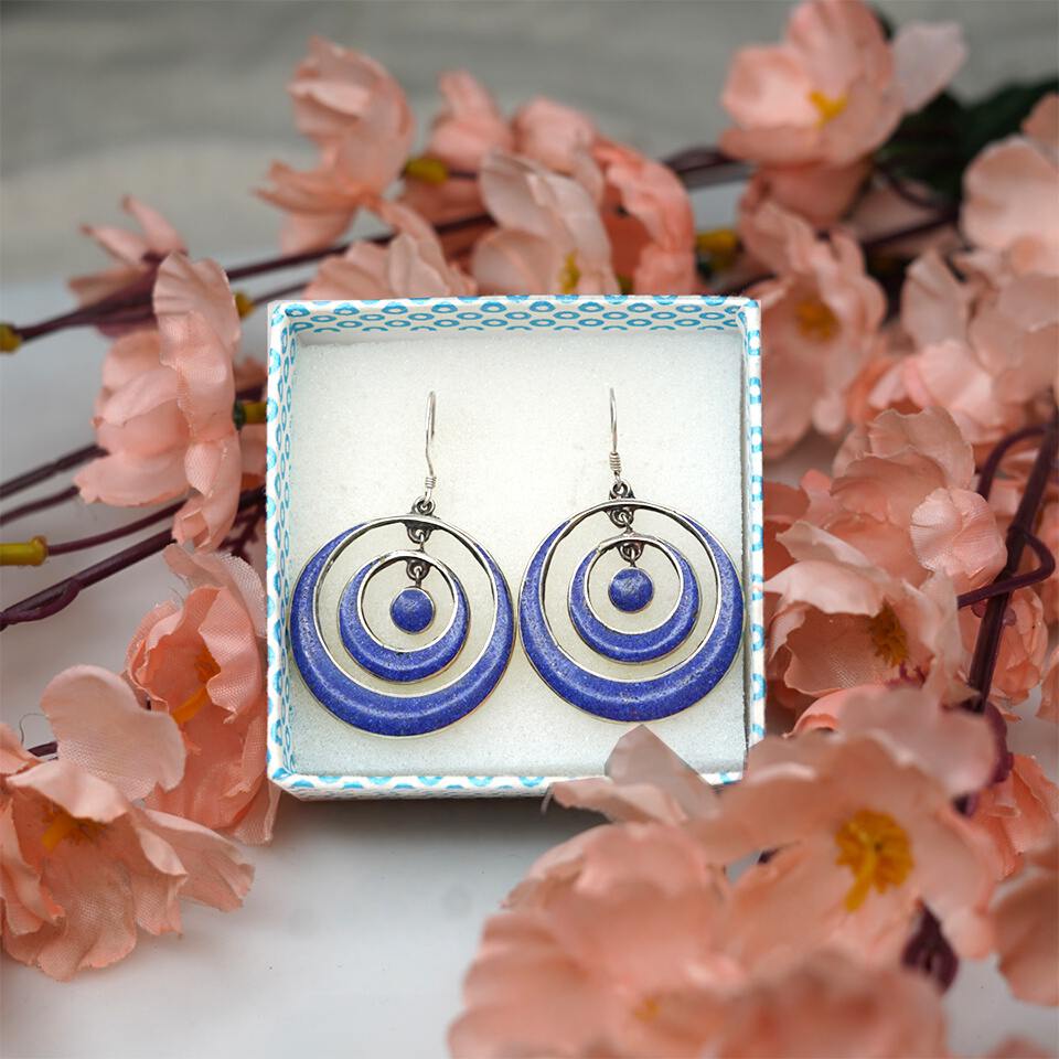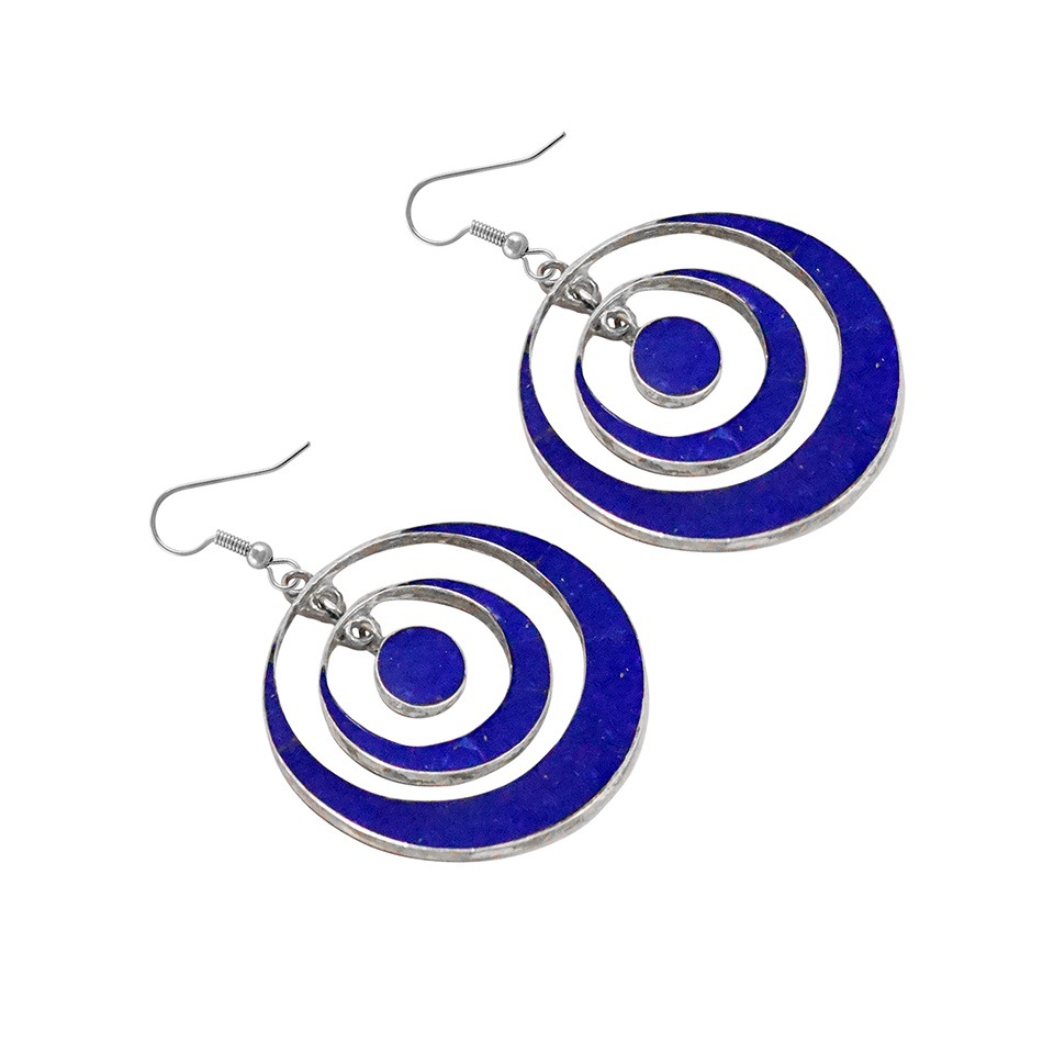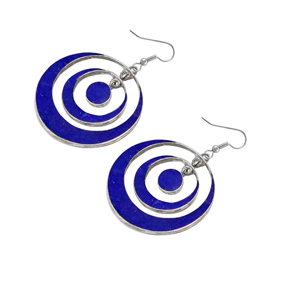- Experience the bohemian charm of our handcrafted silver-plated round dangle earrings, made by skilled artisans with ethically sourced, compressed Lapis Lazuli gemstones. Known for promoting wisdom and enhancing inner strength, the Lapis Lazuli adds a touch of luxury to this affordable boho jewelry. These fashion-forward earrings, with a 2-micron pure silver coating over brass, offer a brilliant shine and long-lasting appeal. The hypoallergenic 925 sterling silver ear wires are perfect for sensitive ears. Measuring 5.2 cm in length and 3.7 cm in width, and weighing 12 grams, these handmade earrings bring a unique blend of ethnic tradition and modern design to women’s fashion, making them a must-have for any jewelry collection.