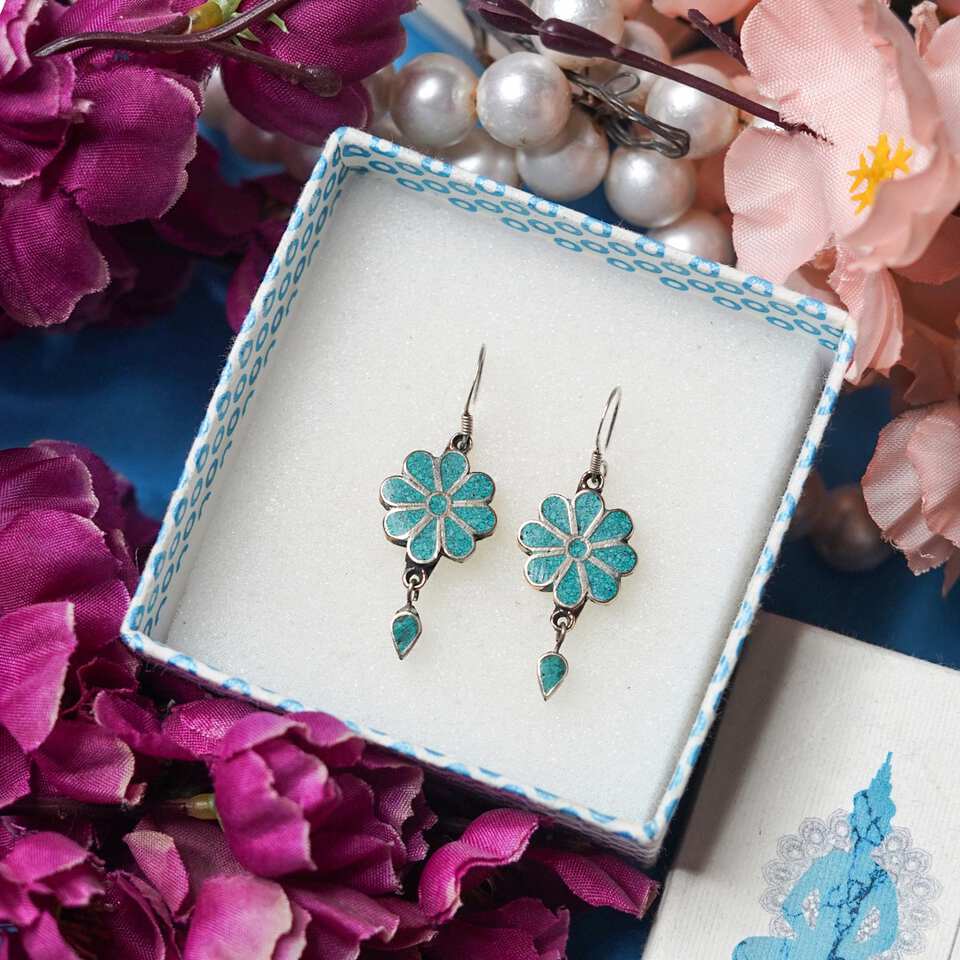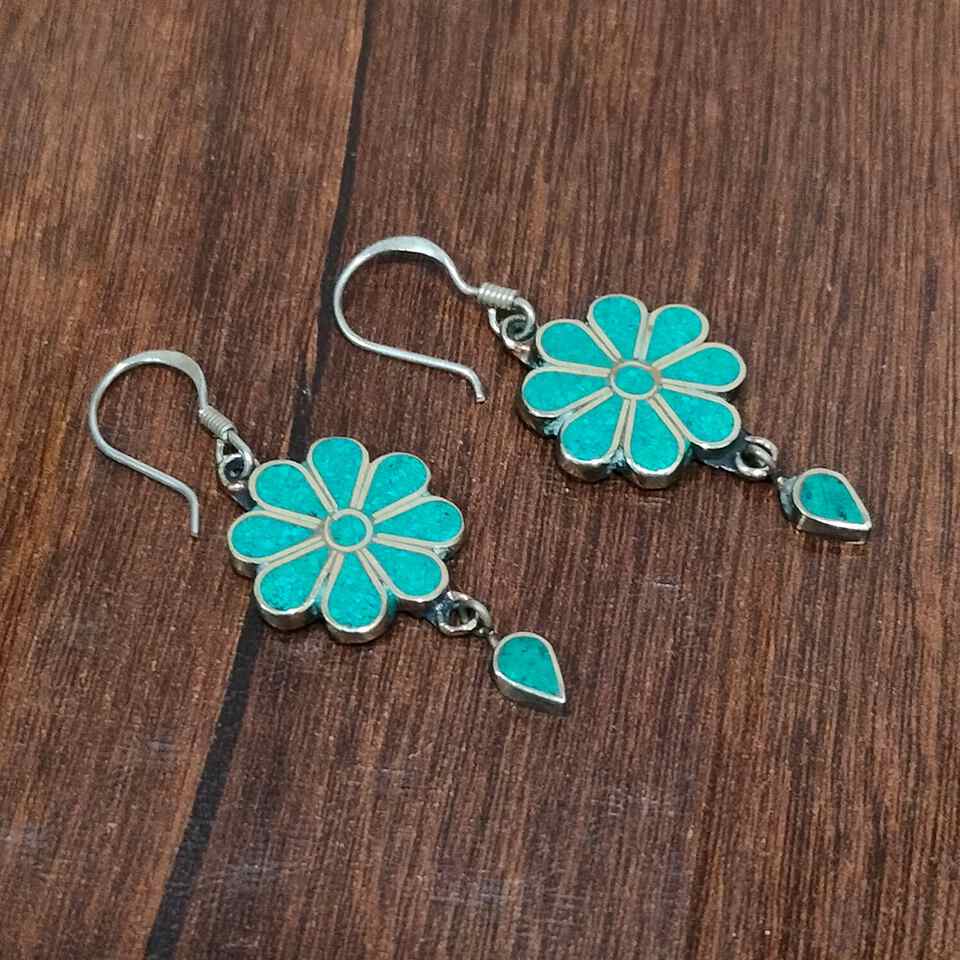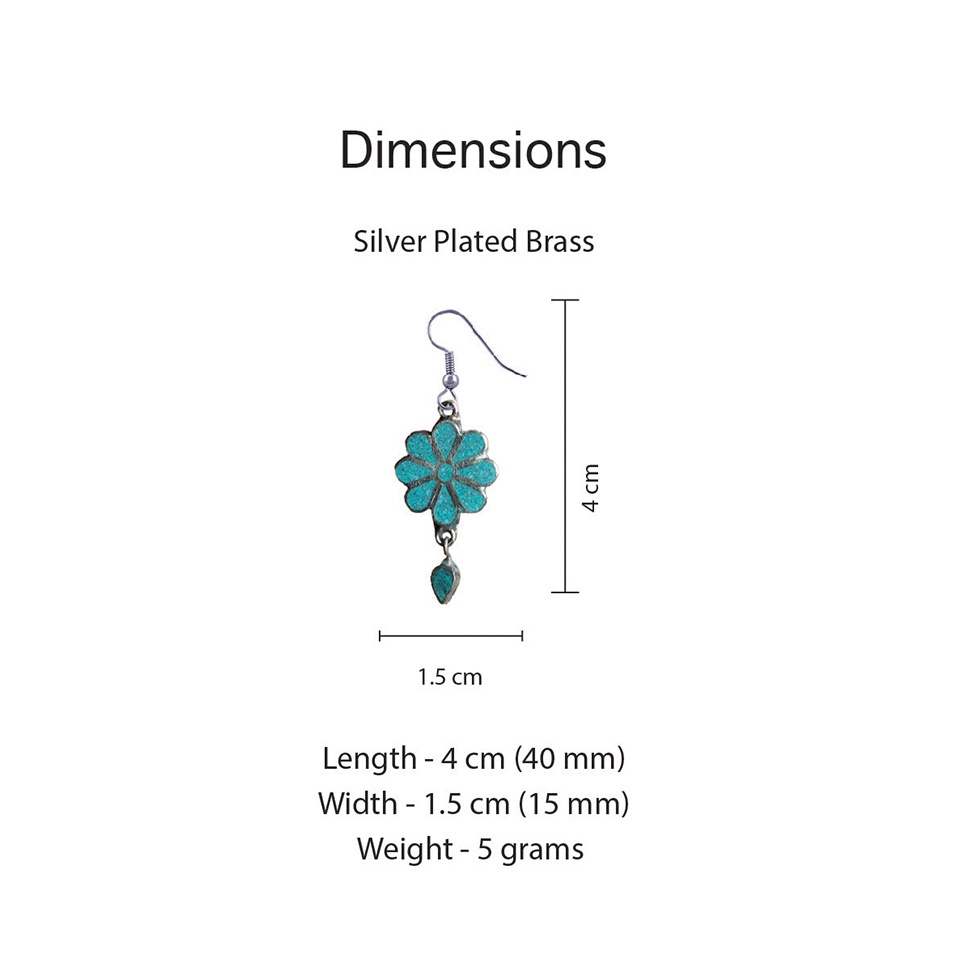 - Elevate your style with our Turquoise Gemstone Flower Design Boho Drop Earrings, featuring a handmade design by skilled artisans. Measuring 4 cm x 1.5 cm and weighing just 5 grams, these earrings showcase ethically sourced crushed natural turquoise, celebrated for its calming properties. Designed for women who appreciate affordable luxury, these fashion-forward accessories are perfect for any occasion and embody the essence of boho jewelry.