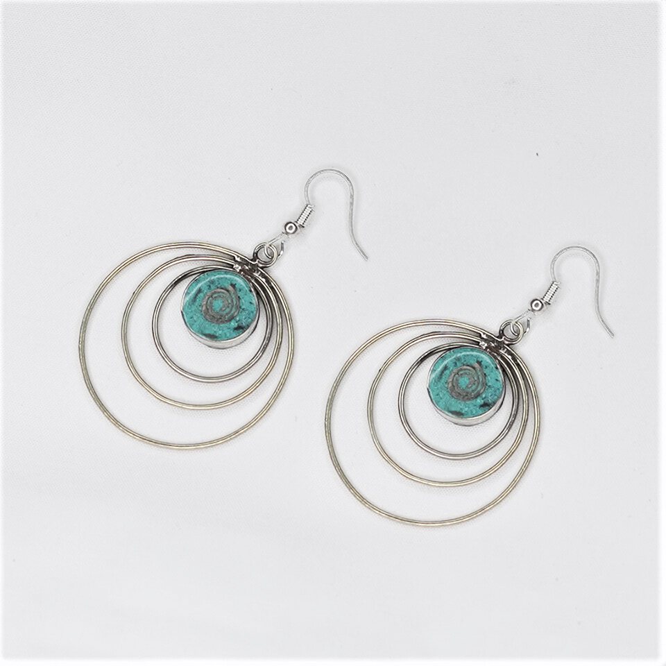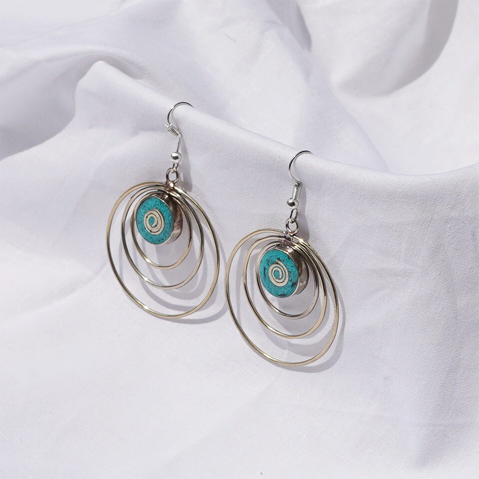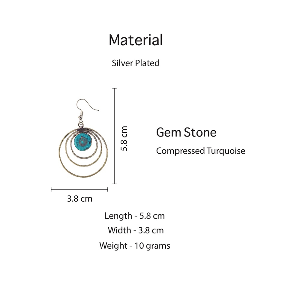 - Discover the beauty and benefits of our handmade Turquoise Gemstone Boho Fashion Dangle Earrings, crafted by traditional artisans to infuse your wardrobe with modern contemporary design. These ethically sourced turquoise stones are believed to bring balance and tranquility, making them more than just a fashion statement. Each earring features a 2-micron pure silver coating over brass, combining affordable luxury with a long-lasting shine. The hypoallergenic ear wires made from pure 925 sterling silver ensure comfort for sensitive ears. With a length of 5.8 cm and width of 3.8 cm, these 10-gram earrings exude a unique Bohemian charm. Experience the elegance of boho jewelry made by skilled artisans, offering a perfect fusion of ethnic style and fashion-forward appeal.