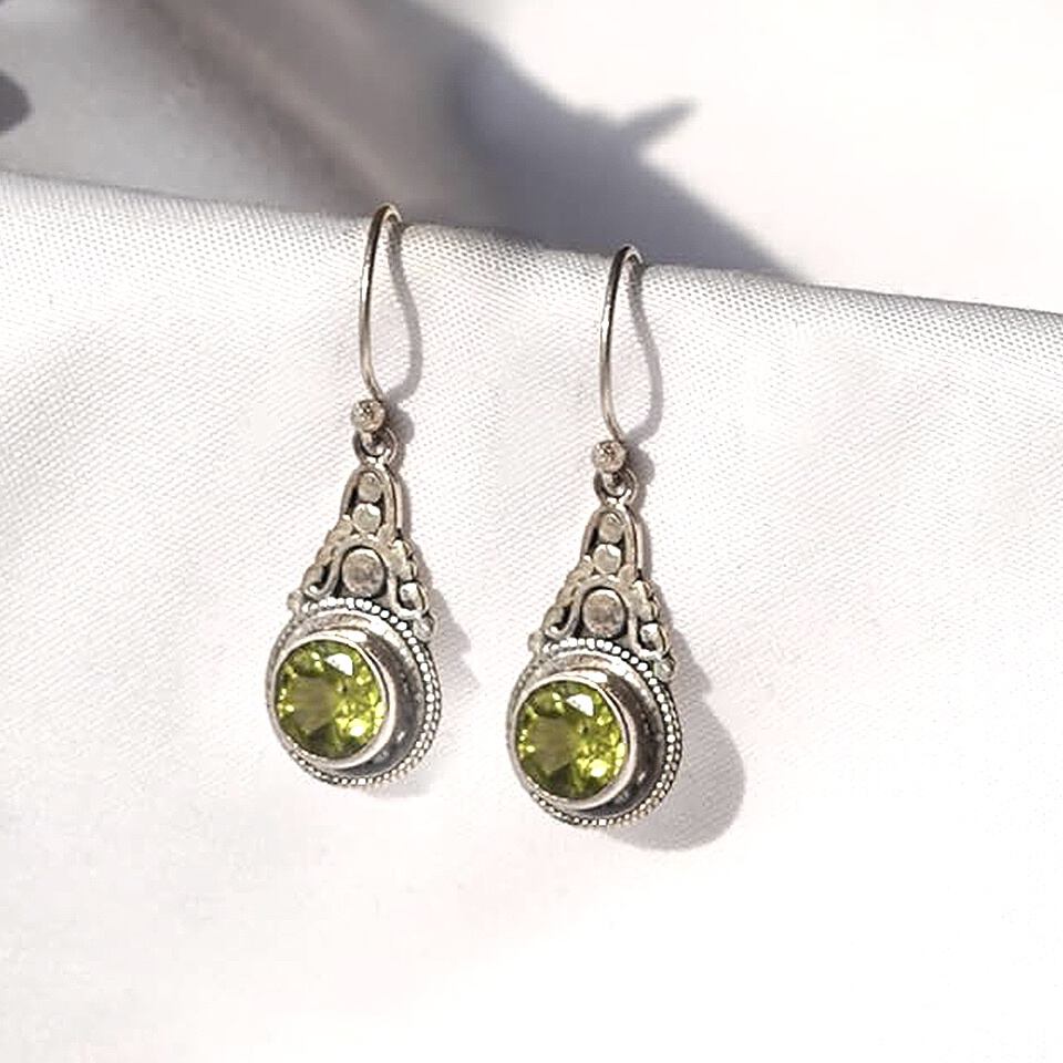 • Experience luxury elegance with our handmade 925 sterling silver drop earrings for women. These unique designer earrings feature a stunning round green Peridot gemstone, known as the August birthstone, symbolizing strength and protection. Crafted with tribal-inspired filigree, each earring is a delicate 3 cm x 1 cm and weighs 4 grams. The modern, minimalistic style combines dainty fashion with a statement look, perfect for both everyday wear and as a distinctive fashion accessory for any occasion. These elegant earrings make a unique addition to your jewelry collection and an exceptional gift for the modern woman.