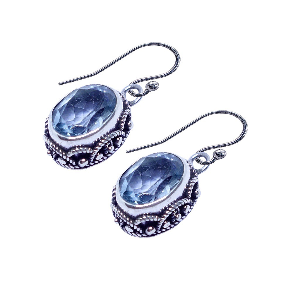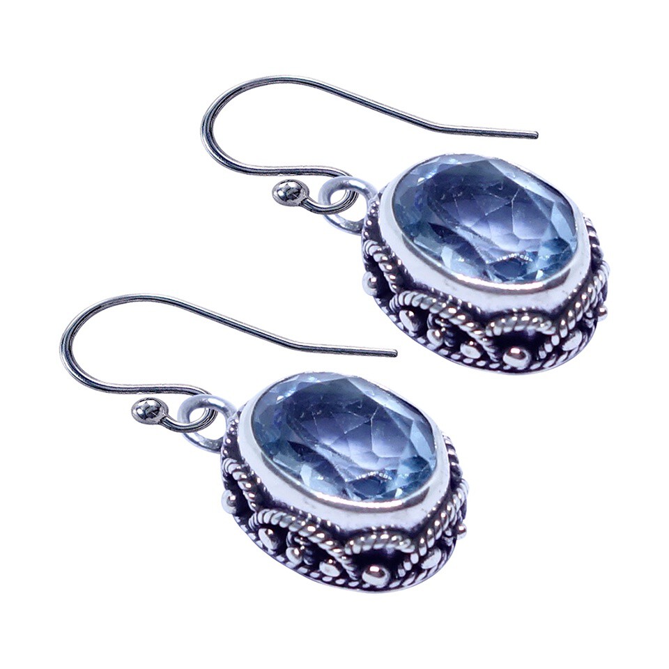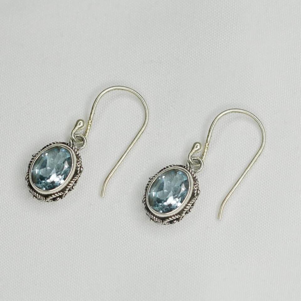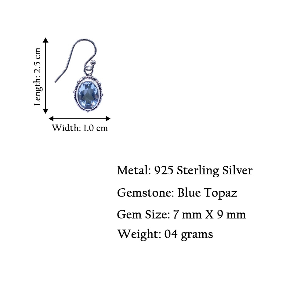 - Crafted with meticulous attention to detail, these handmade 925 sterling silver drop earrings feature stunning blue topaz gemstones, the birthstone of December, known for its tranquil energy. The earrings showcase intricate tribal-inspired filigree design and a dainty, oval shape, making them a luxurious and elegant choice for modern women. Lightweight at 4 grams, with dimensions of 2.5 cm x 1 cm, these unique statement earrings are perfect for everyday elegance or as a standout piece in any gemstone jewelry collection.