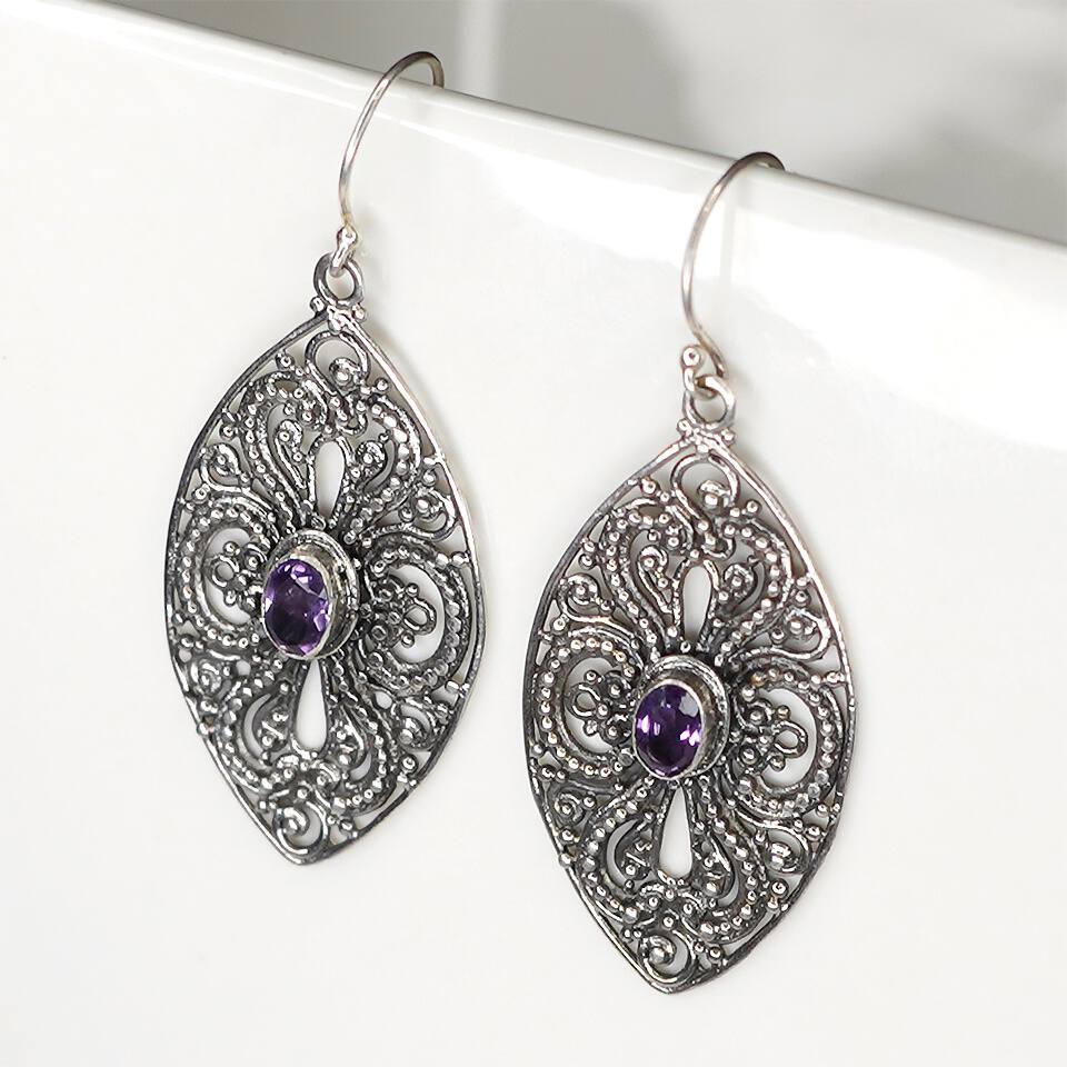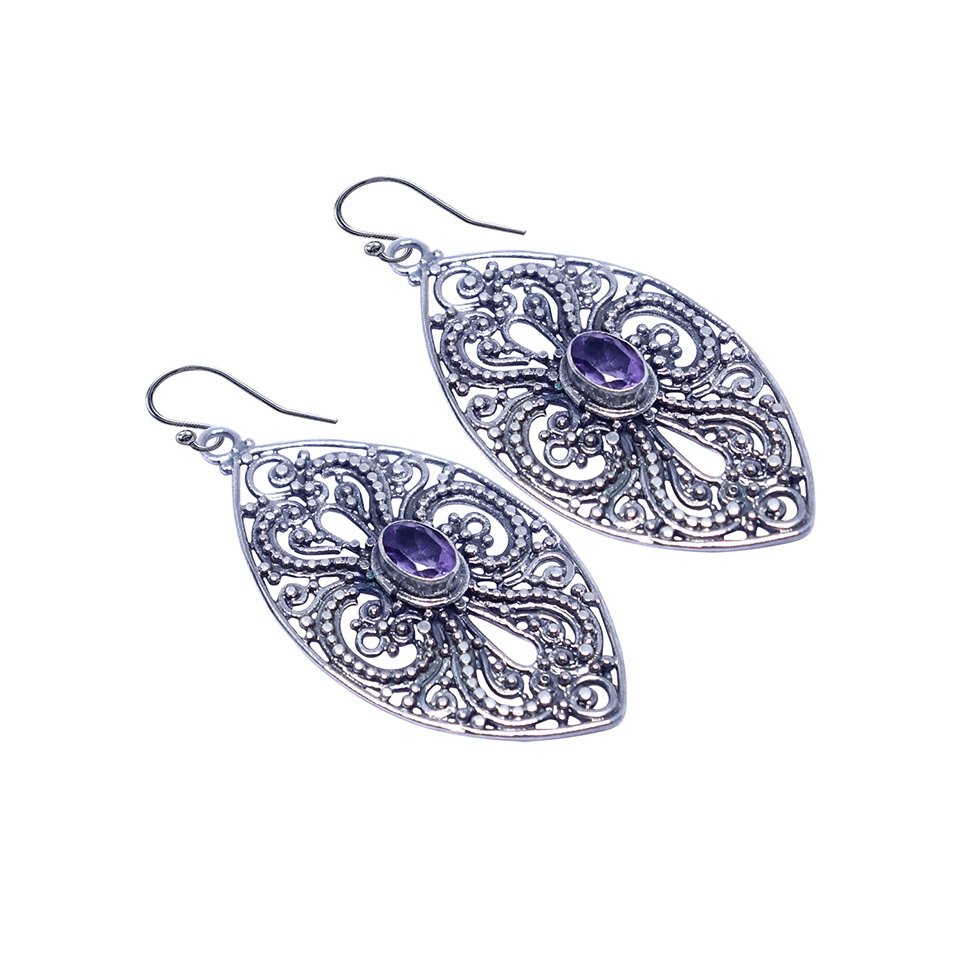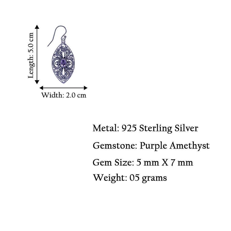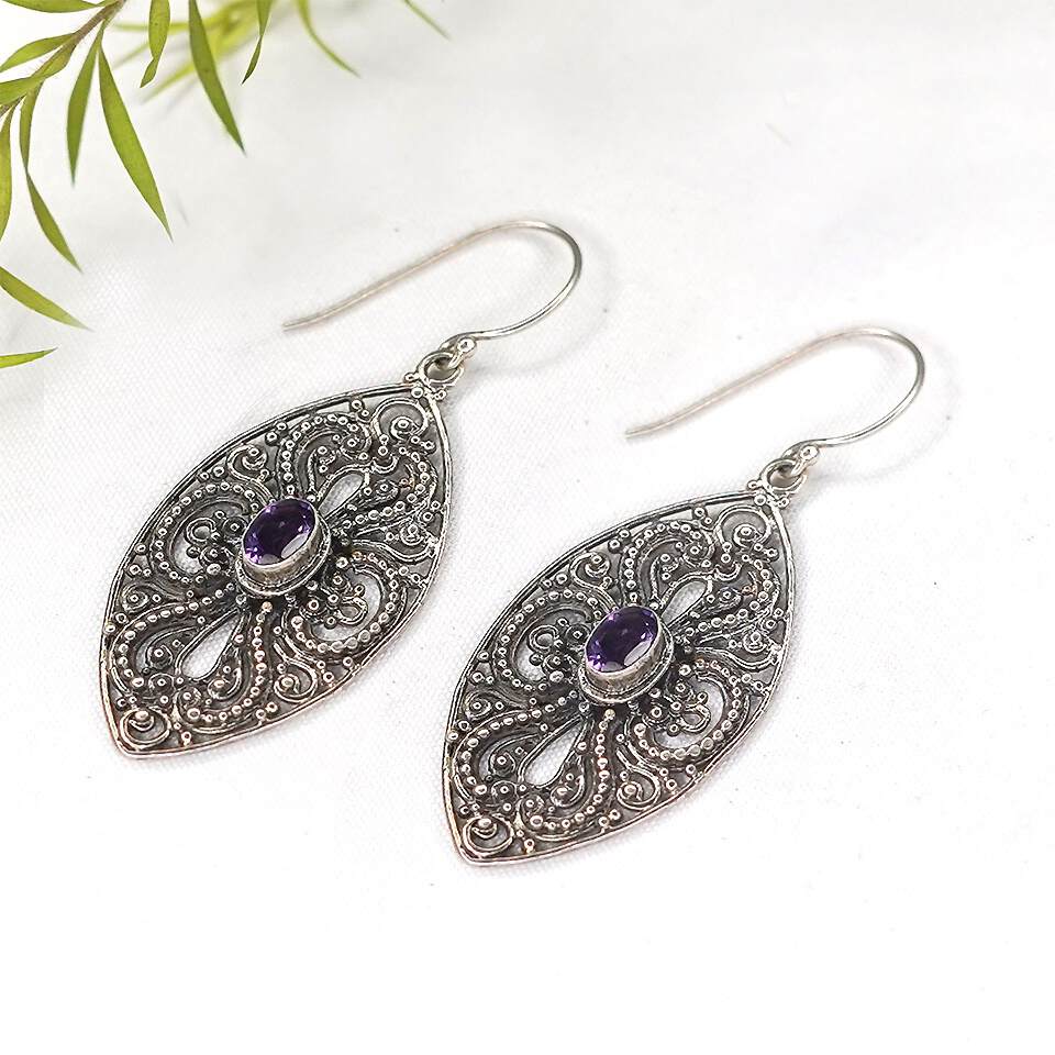 - Discover the beauty of our handmade 925 sterling silver drop dangle earrings, featuring an elegant oval design adorned with a stunning purple amethyst gemstone. Measuring 5 cm x 2 cm and weighing just 5 grams, these lightweight earrings are perfect for women who appreciate unique and minimalistic fashion. The intricate tribal-inspired filigree adds a touch of modern elegance, making them a statement piece for any occasion. With their healing properties and February birthstone significance, these earrings are a thoughtful addition to any jewelry collection, ideal for everyday wear or special events.