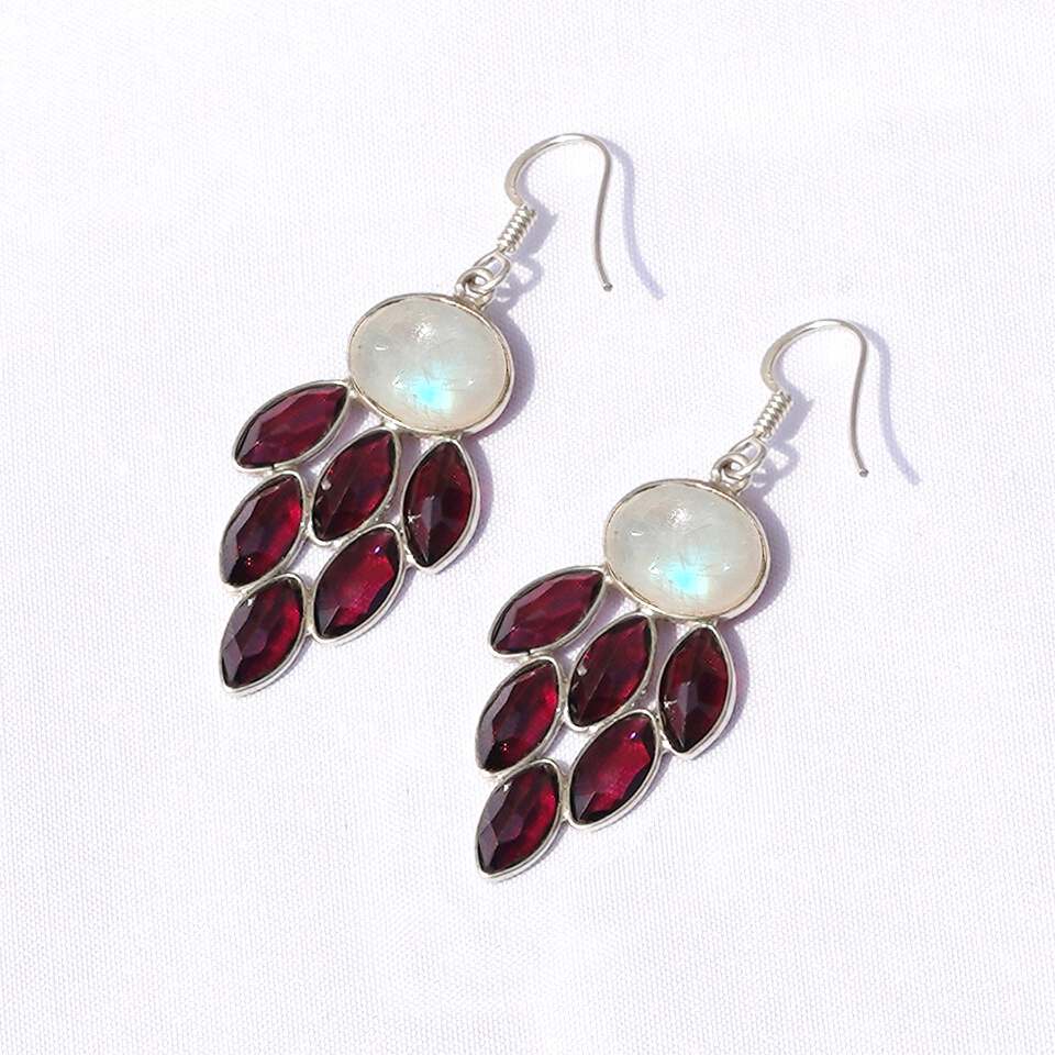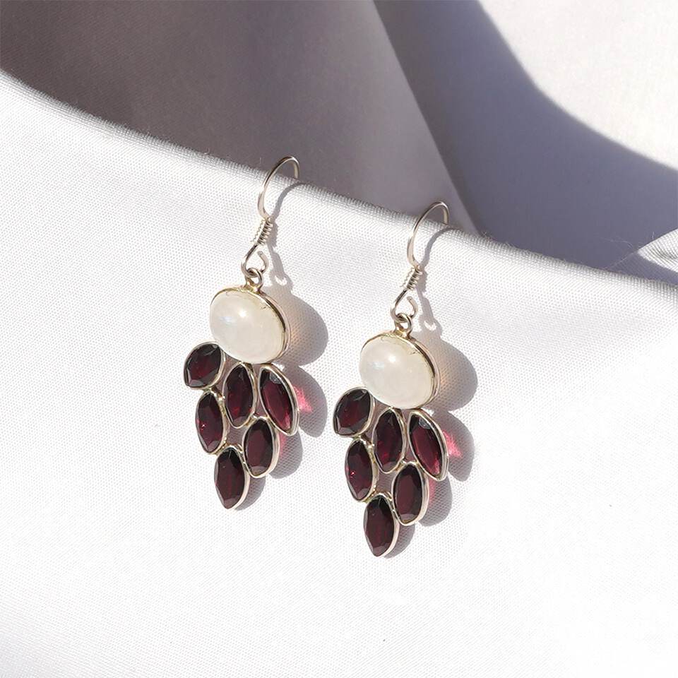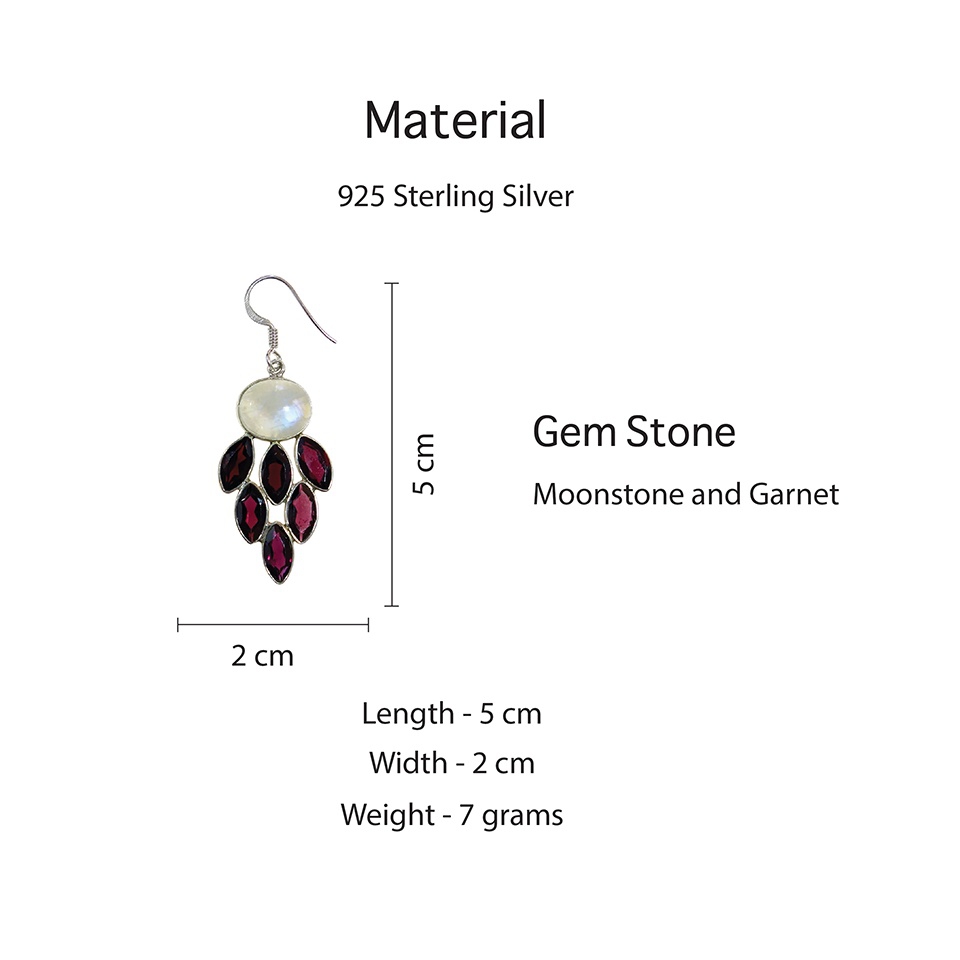 - Experience the luxury of our handmade 925 Sterling Silver Moonstone and Garnet Drop Earrings. Designed for modern women, these elegant earrings feature a unique marquise shape, measuring 5 cm in length and 2 cm in width. Weighing just 7 grams, ensuring comfort throughout the day. These dainty statement earrings showcase the vibrant colors of natural Mozambique Garnet, a January birthstone symbolizing passion and energy. The moonstone, known for its connection to intuition and emotional balance, enhances the earrings’ allure, making them perfect for everyday wear or special occasions. They are the ideal addition to any jewelry collection.