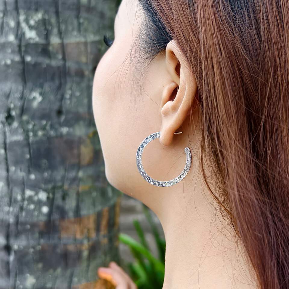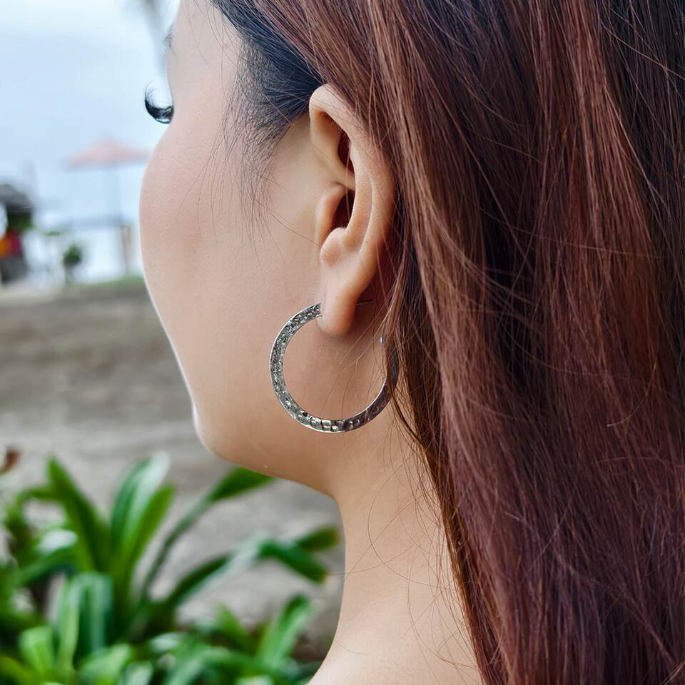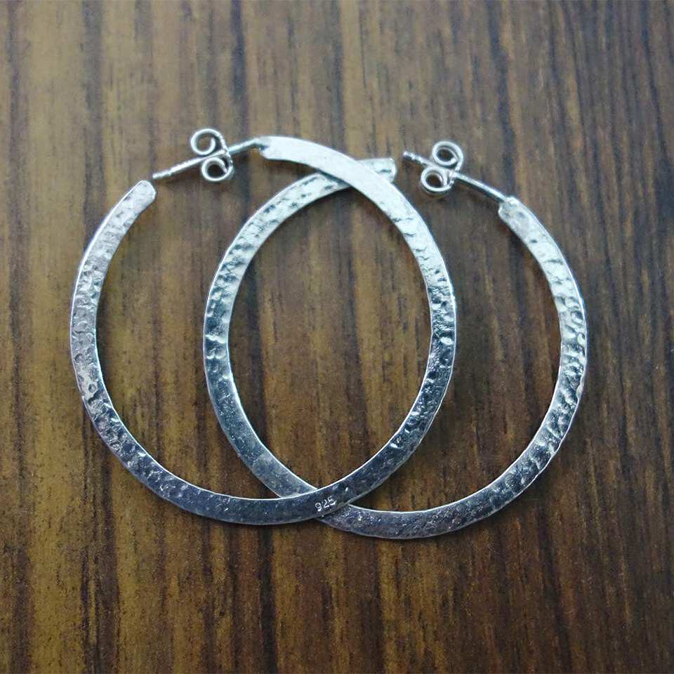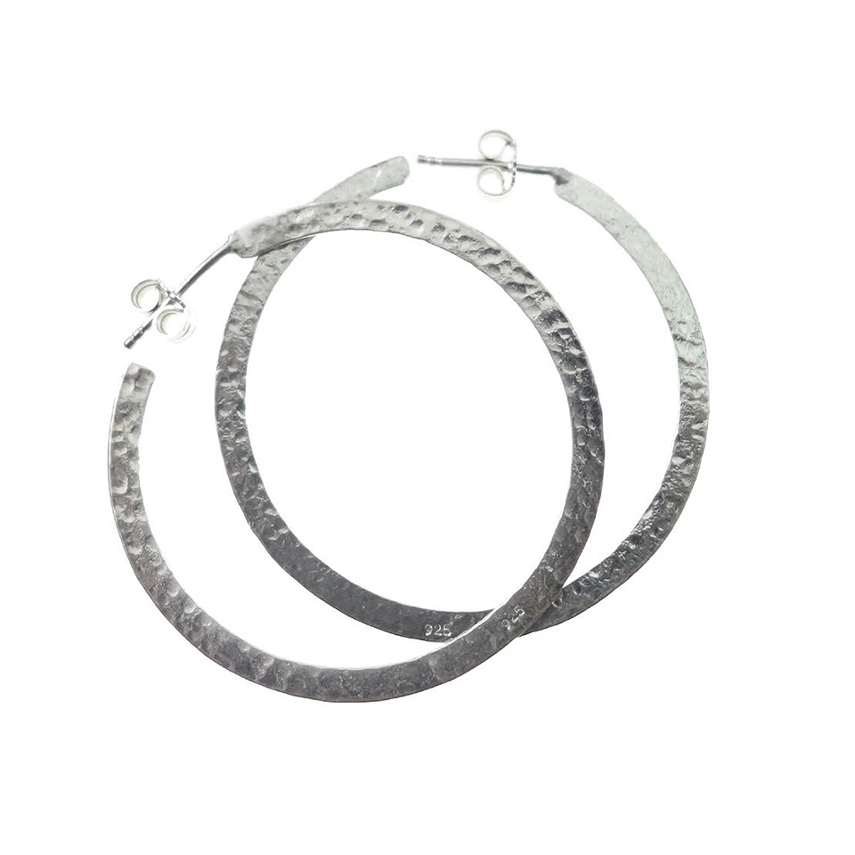 - These luxurious, elegant hoop earrings are handcrafted from genuine 925 sterling silver, showcasing a modern contemporary and minimalistic design. Measuring 3 mm in width and 3.5 cm in height, each earring is lightweight at only 3 grams, making them comfortable for all-day wear. Ideal for women who appreciate a touch of sophistication, these earrings are a statement piece that enhances any outfit. With a hinged hoop back finding, they offer a secure and easy fit. Elevate your jewelry collection with these fine handmade earrings that blend contemporary style with ethnic tribal boho aesthetics.
