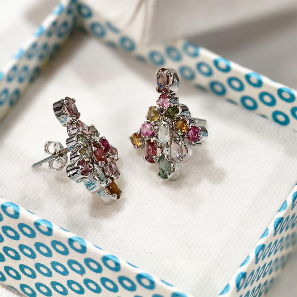 - Elevate your jewelry collection with our October Birthmonth Tourmaline Gemstone Designer Stud Earrings, crafted in ethically sourced 925 sterling silver. These modern contemporary earrings feature a stunning multi color tourmaline, known for its ability to promote emotional balance and healing. With dimensions of 25 x 19 mm and a lightweight of 6 grams, these luxury affordable earrings are the perfect statement piece for women, combining style and substance.