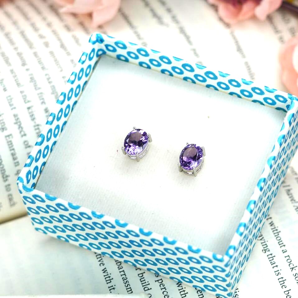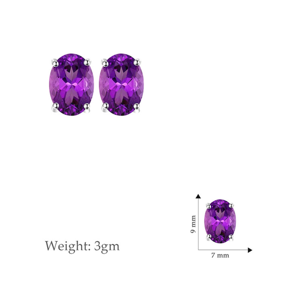 - Elevate your style with our luxury affordable Purple Amethyst Gemstone Stud Earrings, designed for modern contemporary tastes. These minimalistic earrings feature ethically sourced oval amethyst stones set in prong settings, measuring 9 mm in length and 7 mm in width, and weighing just 3 grams. Wearing amethyst is believed to promote calmness and clarity, making these earrings a beautiful addition to any woman?s jewelry collection.