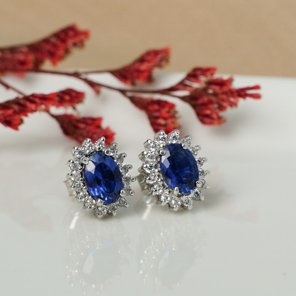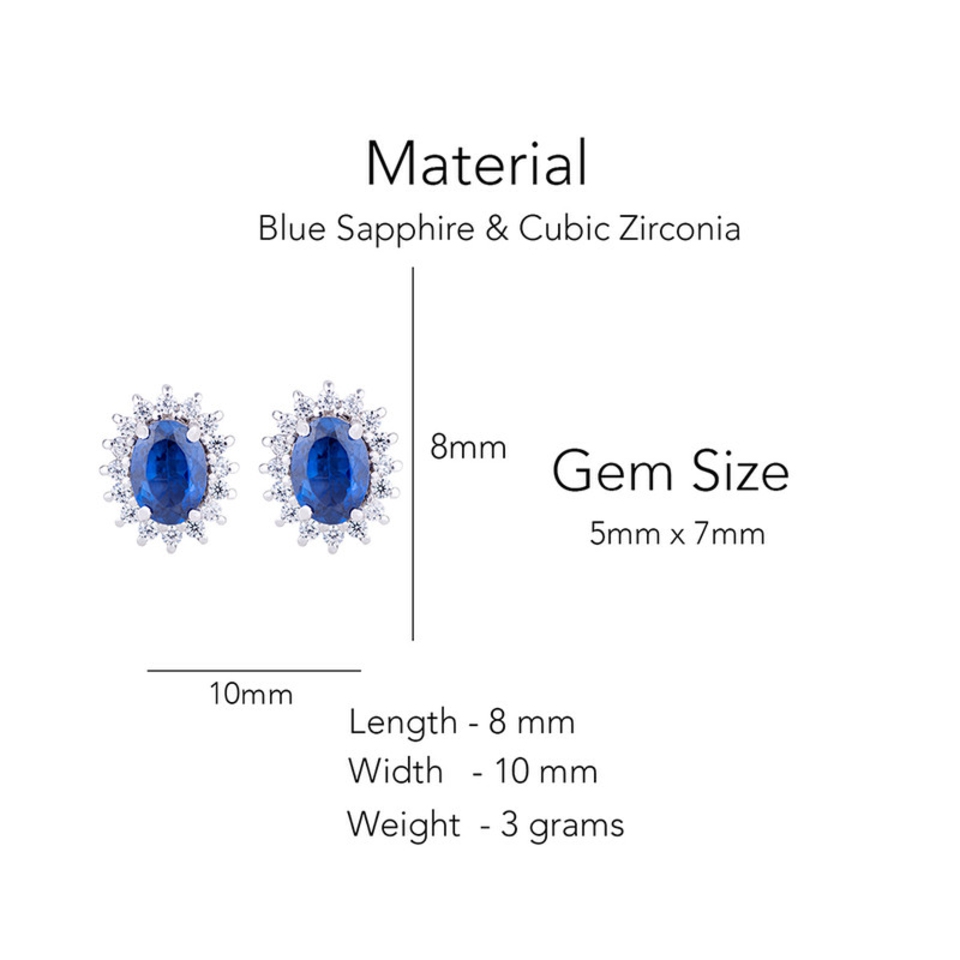 - Embrace timeless elegance with our September Birthmonth Stud Earrings, crafted from 925 sterling silver and featuring a stunning halo design. Adorned with a mesmerizing created Blue Sapphire at the center and surrounded by sparkling Cubic Zirconia, these earrings exude sophistication and brilliance. The rich blue hue of the sapphire, contrasted with the dazzling white gemstones, creates a striking balance of color and sparkle. Perfectly sized at 10 x 8 mm and weighing just 4 grams, these lightweight yet durable earrings make a versatile addition to both everyday wear and formal ensembles, offering a luxurious yet affordable touch of glamour.