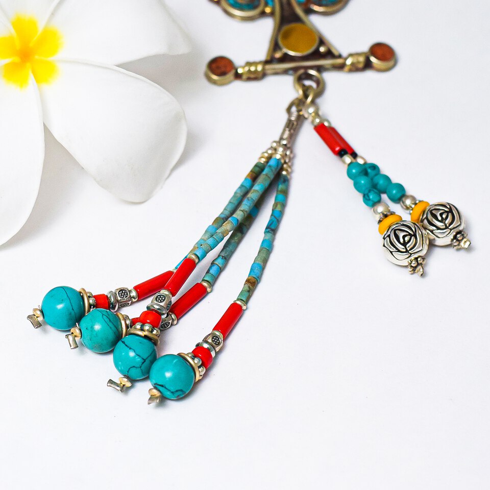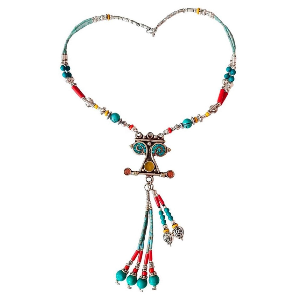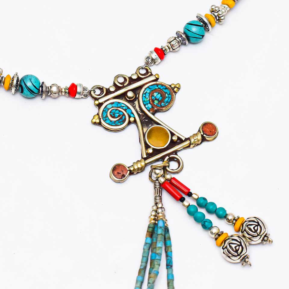This handmade beaded necklace for women features Turquoise, Coral, and Amber gemstones, each symbolizing protection, serenity, passion, vitality, and warmth. Turquoise, the December birthstone, brings positive energy, while Coral, associated with October, represents transformation. Amber adds a touch of natural beauty, known for its grounding properties. A bold and stylish statement piece, it seamlessly blends elegance with designer flair, making it ideal for boho enthusiasts.