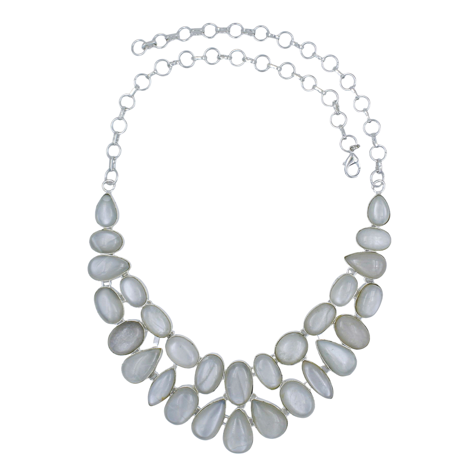 Embrace elegance and mystique with this Handmade Moonstone Silver-Plated Brass Necklace, a luxurious statement piece crafted for women who love globally inspired gemstone jewelry. Featuring natural moonstone gemstones, each piece displays soft white hues, silky translucence, and the enchanting glow of moonstone’s signature adularescence.Every gemstone is carefully hand-cut, polished, and bezel-set in premium silver-plated brass, creating a lustrous, durable finish. The cascading multi-stone layout forms a dramatic, high-fashion silhouette that beautifully elevates any outfit—perfect for weddings, evening events, celebrations, travel, and global casual-luxe styling.Moonstone is admired worldwide for its magical, feminine energy and serene glow, making this necklace a meaningful and captivating choice for jewelry lovers across all cultures.
