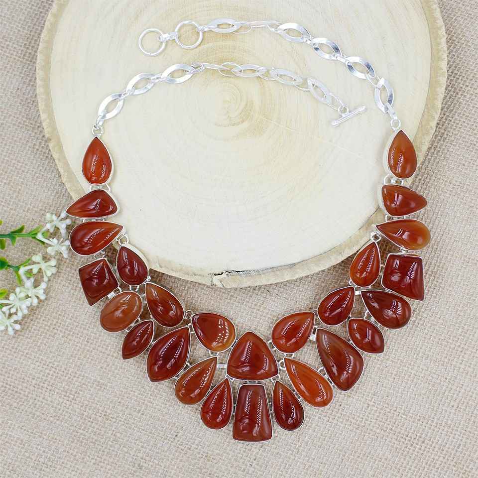 Make a powerful style statement with this Handmade Red Onyx Silver-Plated Brass Necklace, created for women who love bold fashion, natural gemstones, and artisanal jewelry. Featuring authentic red onyx gemstones, each stone is polished to perfection, highlighting rich shades of deep red, burnt orange, and earthy terracotta.Every gemstone is carefully hand-set in high-quality silver-plated brass, forming a cascading multi-stone bib design that adds dramatic elegance to any outfit. This handcrafted necklace is ideal for international buyers looking for unique, culturally inspired gemstone jewelry.Red Onyx is known around the world as a stone of strength, grounding, and confidence. Its vibrant energy makes it perfect for women who embrace bold style with emotional meaning.