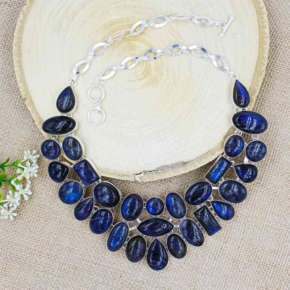 Experience the mystical beauty of genuine labradorite with this Handmade Labradorite Silver-Plated Brass Choker Necklace, crafted for women who adore bold statement jewelry and natural gemstones. Each labradorite stone is hand-selected for its deep blue and violet flashes, known as the famous labradorescence, making every piece truly one of a kind.This artisanal choker features a multi-stone layout set in high-quality silver-plated brass, offering durability, shine, and a luxurious finish. Designed to sit beautifully around the neckline, it blends modern elegance with bohemian charm—perfect for fashion markets and contemporary jewelry lovers.Labradorite is celebrated worldwide as a stone of intuition, protection, and transformation, making this necklace not only a stunning accessory but also a meaningful gemstone piece.Perfect for special occasions, global gifting, and statement styling, this necklace adds a touch of magic to every outfit—from evening wear to everyday chic.
