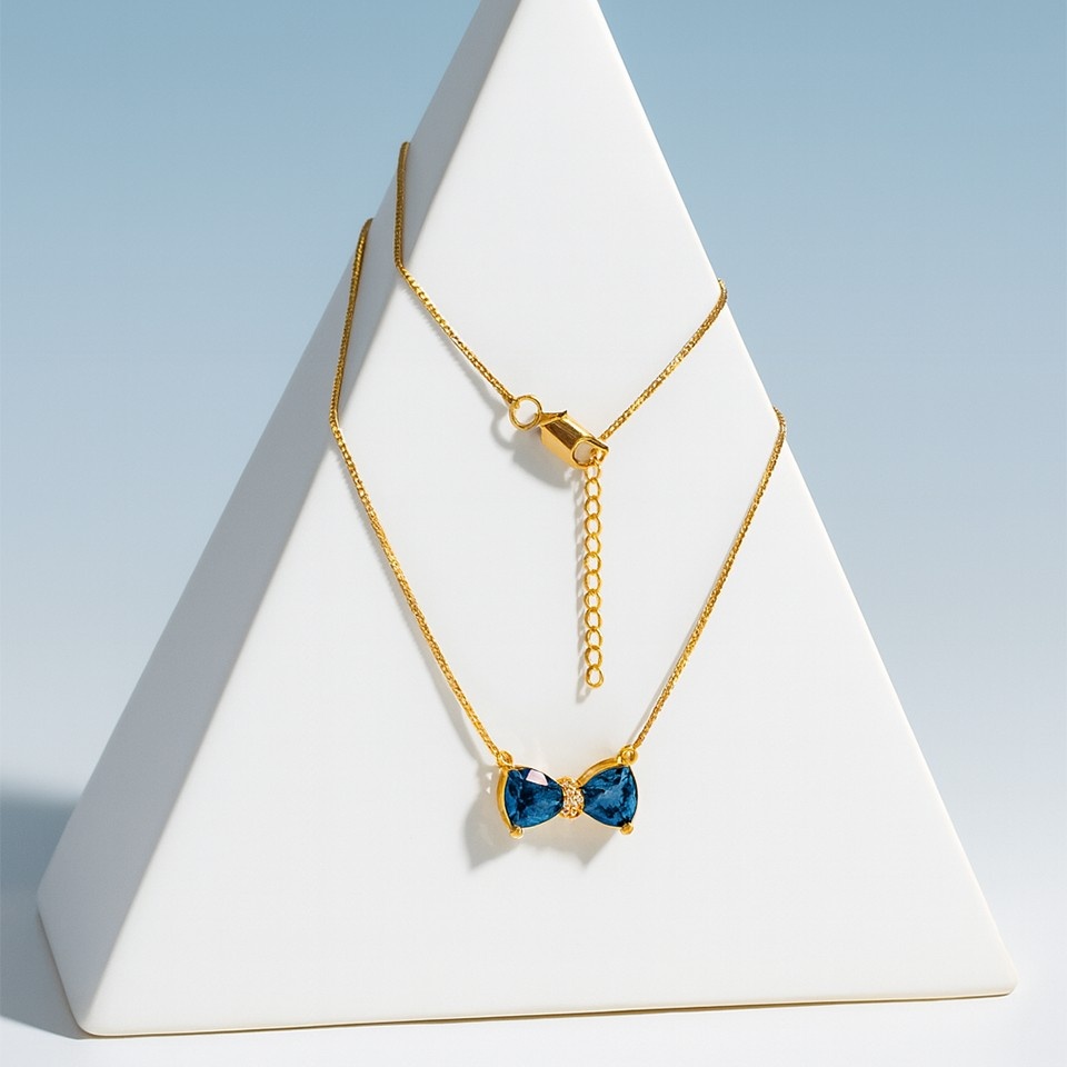 For those who prefer warm-toned luxury, this handcrafted bow pendant necklace showcases genuine London Blue Topaz and sparkling cubic zirconia, beautifully set in gold-plated 925 sterling silver for a radiant, refined finish. The dainty bow design strikes the perfect balance between elegant minimalism and playful sophistication, making it a versatile piece that transitions effortlessly from everyday wear to special occasions.