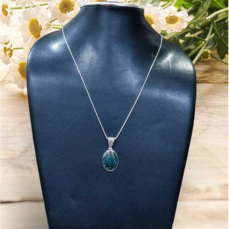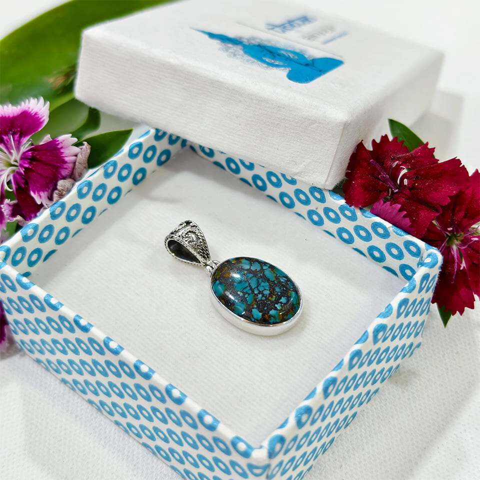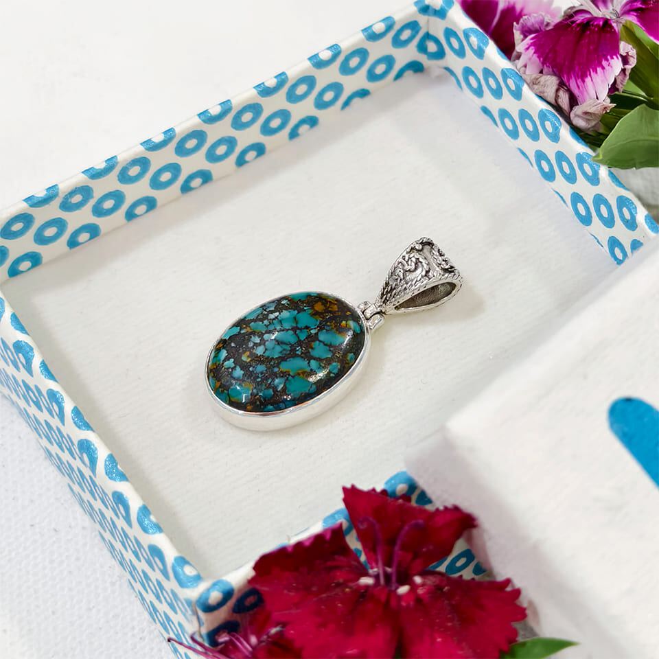 - This stunning handmade jewelry piece features intricate tribal filigree on the loop, crafted by talented artisans. Made of 925 sterling silver, this elegant pendant showcases a beautiful stabilized turquoise gemstone, the birthstone for December, known for its healing properties. With dimensions of 3 cm x 1.5 cm and weighing just 5 grams, this lightweight, modern, and minimalistic design is perfect for women seeking luxury contemporary style.