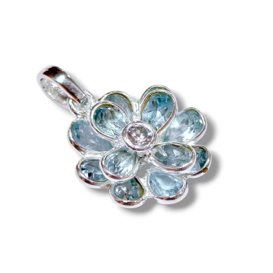 Fresh and radiant, this handcrafted 925 sterling silver blue topaz flower pendant captures the essence of elegance with a soft, luminous glow. Designed in a graceful floral silhouette, the pendant features natural blue topaz gemstones in serene sky-blue hues, symbolizing clarity, calmness, and positive energy. At the center, a brilliant moissanite gemstone adds exceptional sparkle and a refined, diamond-like brilliance that enhances the overall design. Expertly crafted in high-quality 925 sterling silver, the cool-toned metal beautifully complements the tranquil blue stones while ensuring durability, shine, and comfortable everyday wear. The intricate setting highlights each gemstone with precision, creating a harmonious and eye-catching composition that feels both modern and timeless. Lightweight and versatile, this floral pendant is perfect for daily wear, special occasions, or layering with other necklaces. Whether worn as a soothing statement piece or gifted as a symbol of clarity and elegance, this handcrafted gemstone pendant adds refined charm and artisan beauty to any jewelry collection.