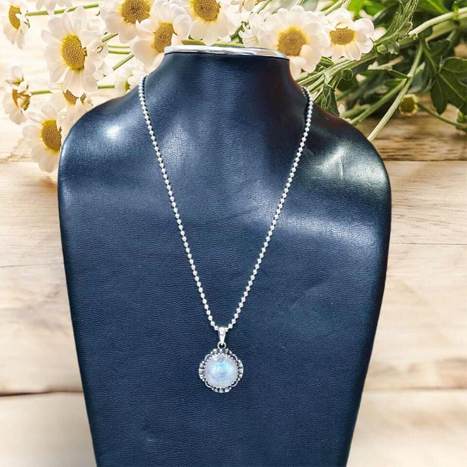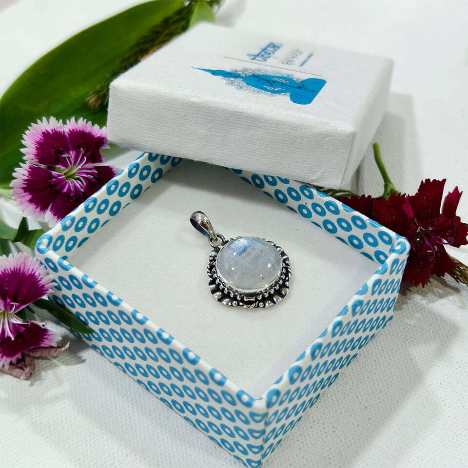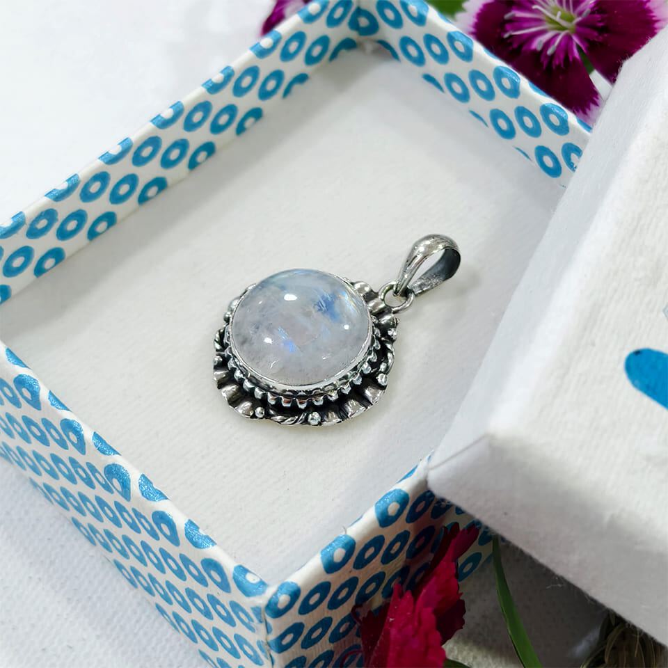 - This luxurious handmade jewelry features an exquisite blue fire hue moonstone gemstone set in elegant tribal filigree. Crafted from 925 sterling silver, this modern contemporary pendant measures 3.5 cm x 2.2 cm and weighs 8 grams. Ideal for modern women, this unique piece combines minimalistic design with the natural beauty of genuine gemstones, making it a perfect addition to any jewelry collection. The moonstone, associated with the birth month of June, is known for its calming and protective properties.