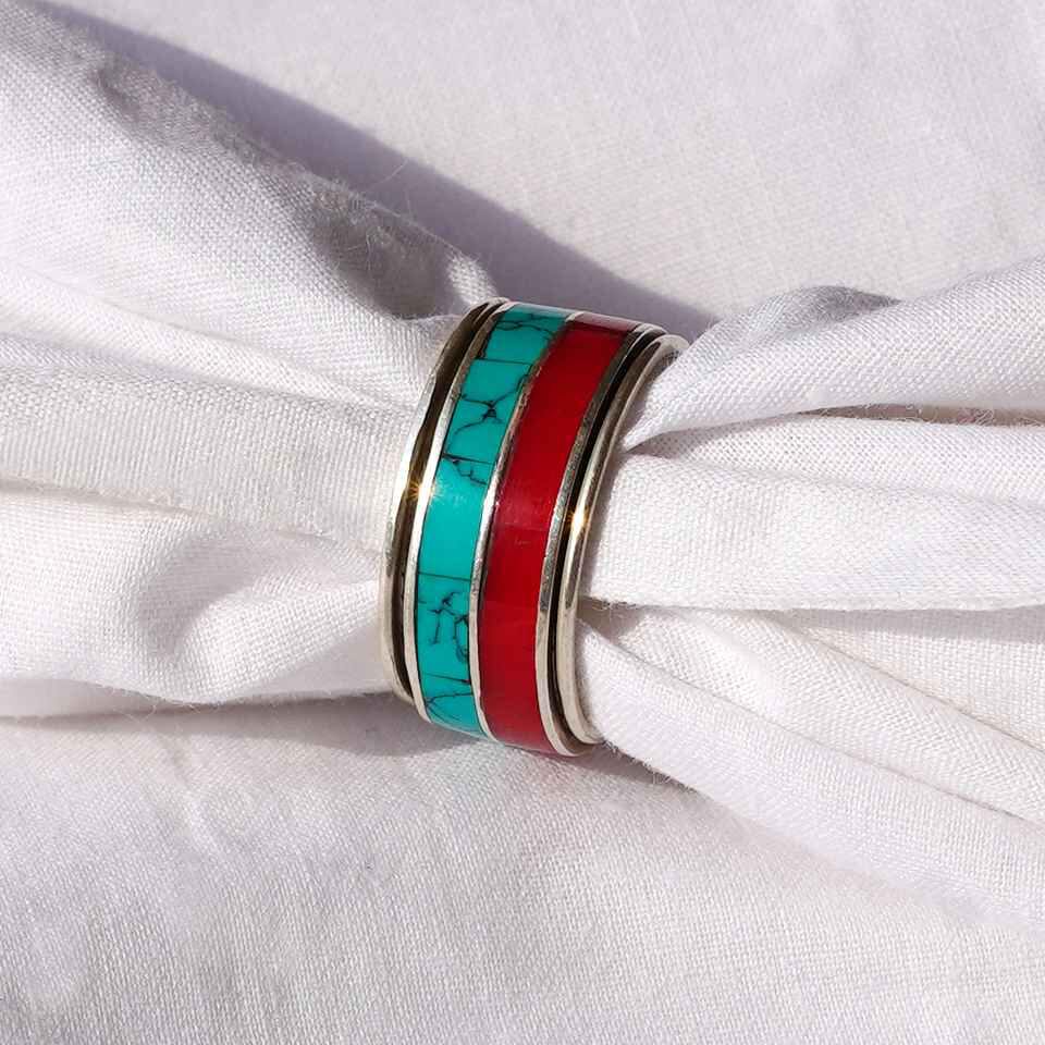 This unique ring showcases vivid coral and turquoise gemstones, beautifully set in an inlay style. Coral, recognized as the birthstone for February, symbolizes passion and protection, while turquoise, the birthstone for December, represents wisdom and positive energy. Together, these gemstones are believed to foster emotional balance, inner peace, and good fortune. The eye-catching combination of red and blue-green hues adds a touch of boho luxury, making it a standout fashion-forward accessory for any occasion.