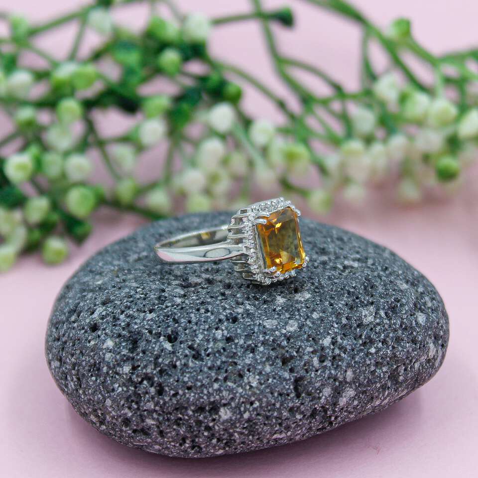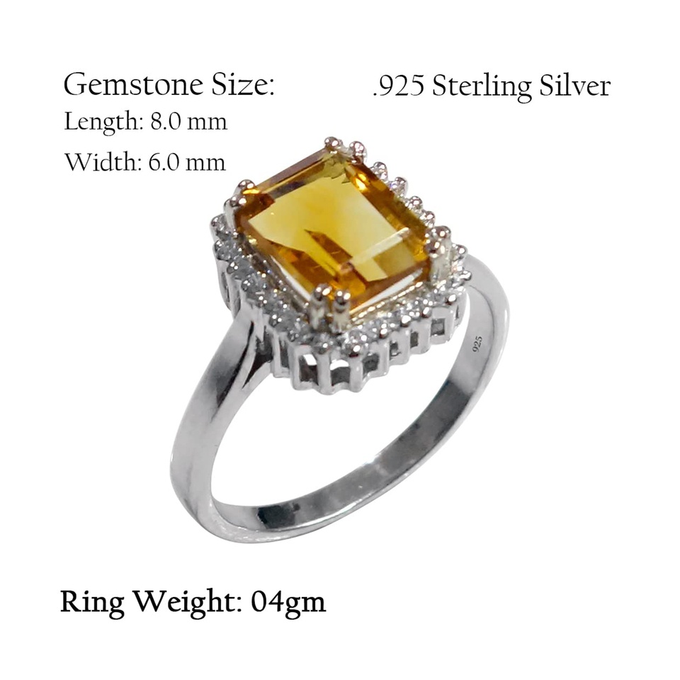 - Made from premium 925 sterling silver, this elegant halo ring showcases a radiant Citrine, November?s birthstone, in warm golden hues. Weighing 4 grams, it offers a balanced feel, with an intricate halo design that enhances its brilliance. A perfect statement piece for any jewelry collection.